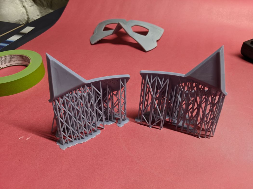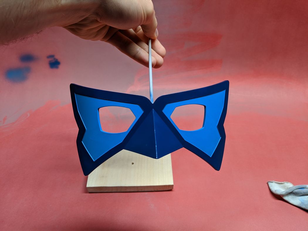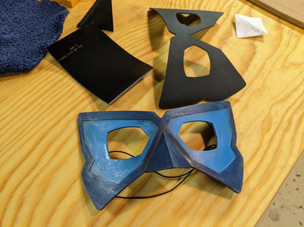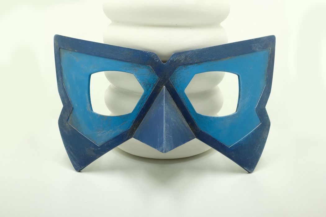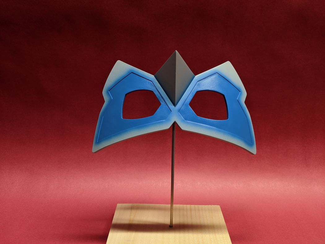 A friend commissioned two of these Blue Morpho masks for cosplay. I recreated the mask shape from reference images taken from the show, and I used 3D scans of the wearer's heads to adjust the mask curvature and nose to ensure a comfortable, close fit to mimic how the mask appears on screen. I 3D printed prototypes for test fits, but the delivered versions were made by thermoforming Kydex and Worbla on a 3D printed form and bonding the layers with Plastruct Bondene solvent cement. One of the prototypes (pictured above) and the final versions were airbush painted to match the on-screen colors and dry brush weathered.