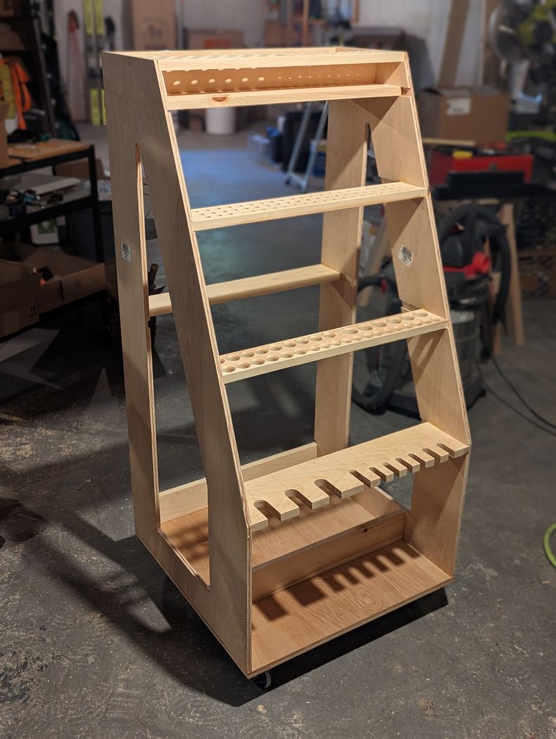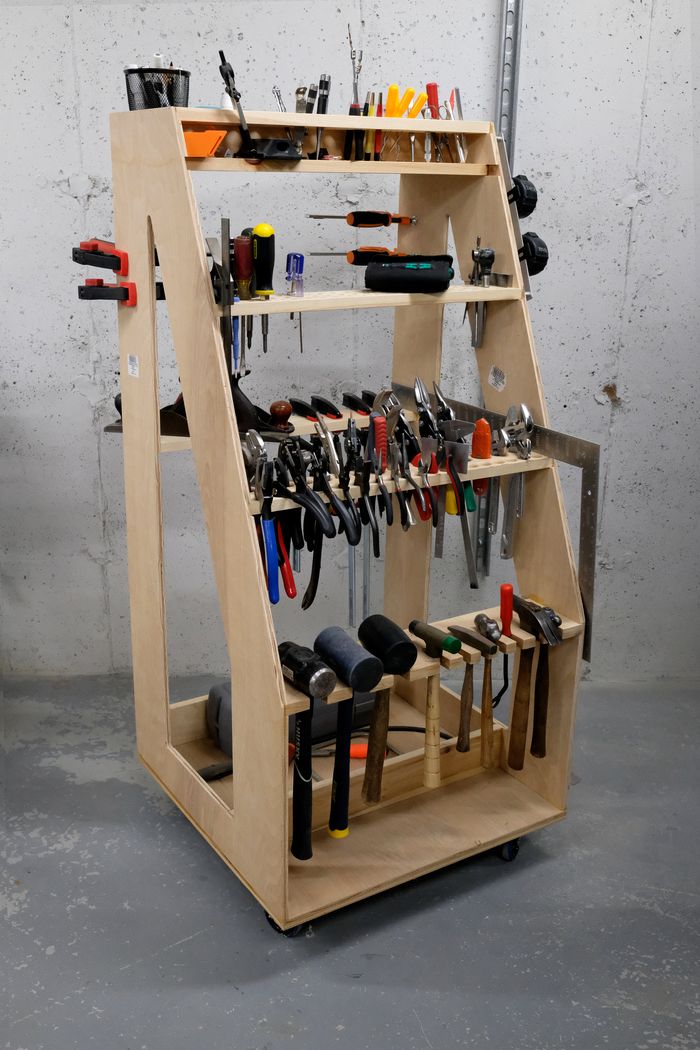 When I moved to new house with a new and very empty basement begging to transform into a workshop, I was inspired by Adam Savage's tool cart. His philosophy on the first order of retrievability means that the tools you use most often should be visible and at hand. I've never been a fan of stashing everything away in cabinets and drawers where they go to die. Having designed, built, and used this cart for a few years now, it feels like some kind of cheat code.